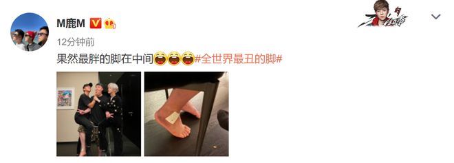 5月26日,鄧超在微博曬與陳赫、鹿晗合照,并調侃陳赫的腳“全世界最丑”;隨后,陳赫發(fā)文反駁:“果然好看的..還是在中間”;鹿晗則稱:“果然最胖的腳在中間”。三人互懟,畫風十分歡樂。