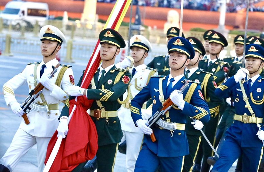 10月1日清晨,中國人民解放軍儀仗隊護送國旗走向升旗臺。