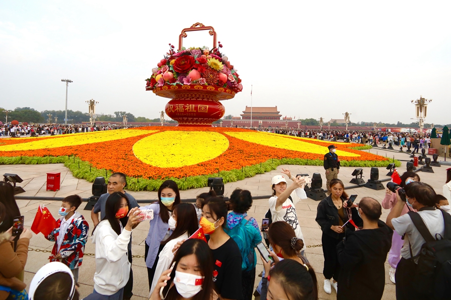 10月1日晨,在北京天安門廣場,游客參加國慶升旗儀式。