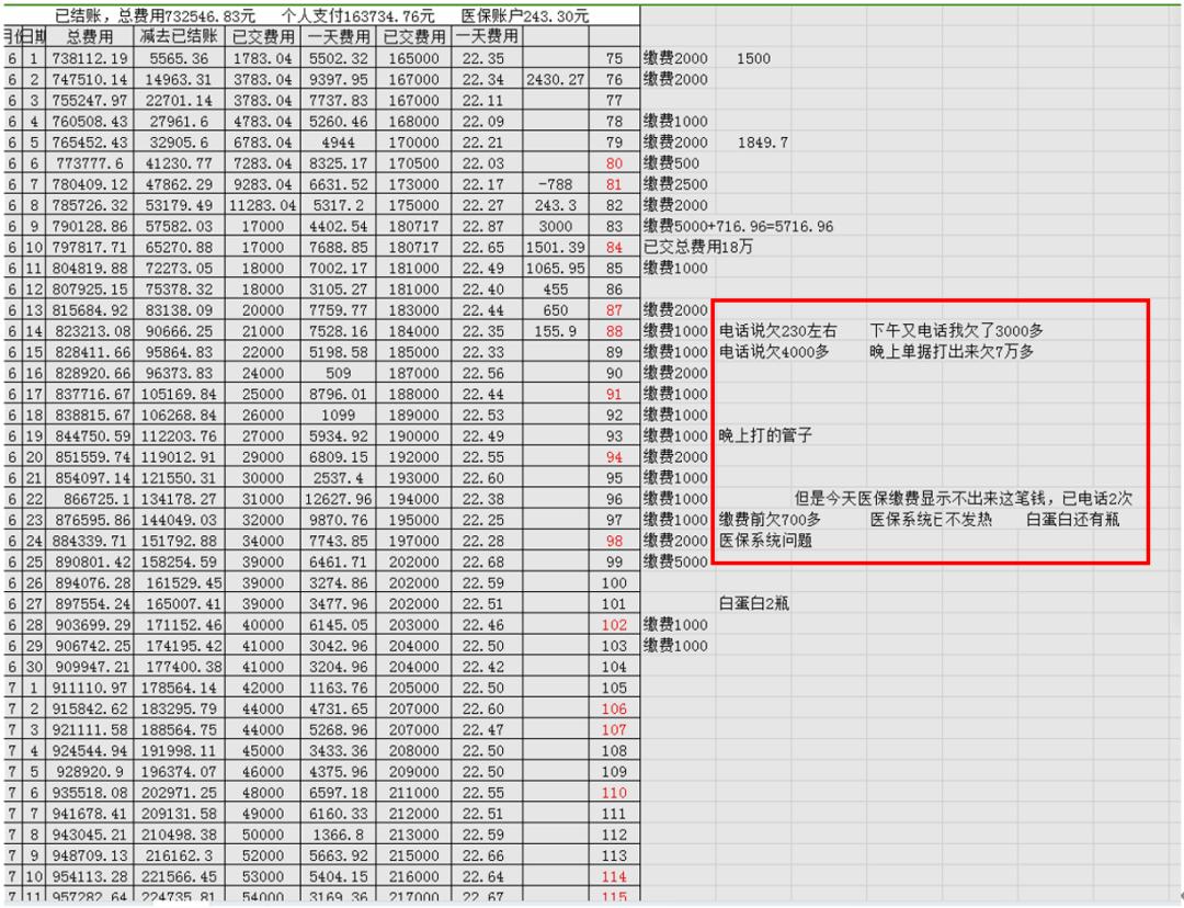 我姑媽是一名老會(huì)計(jì),負(fù)責(zé)每天往醫(yī)院賬上交費(fèi)。她每次交完費(fèi)用,會(huì)讓ICU的護(hù)士打一個(gè)單子,看看上面的費(fèi)用結(jié)余。累積了數(shù)十張單子之后,姑媽做了一個(gè)Excel表,根據(jù)國(guó)家醫(yī)保目錄和蕪湖市醫(yī)保支付的有關(guān)政策,推算出每天需要自費(fèi)的大致比例。