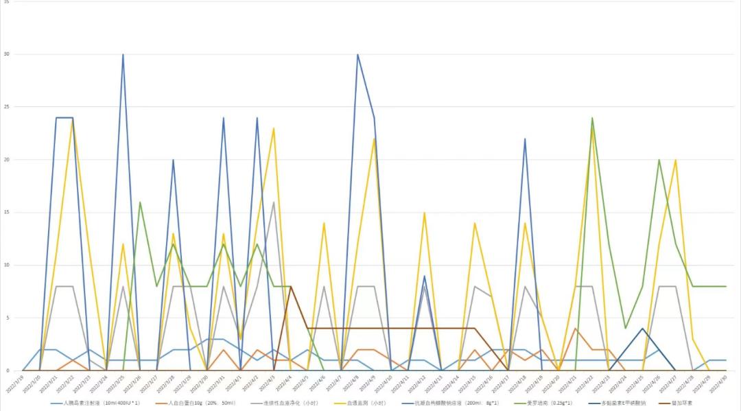 通過(guò)趨勢(shì)圖,我可以迅速發(fā)現(xiàn)波動(dòng)異常的治療項(xiàng)目及關(guān)聯(lián)項(xiàng)目,都不用做回歸分析。其中,波動(dòng)比較大的項(xiàng)目有血透、抗生素等。